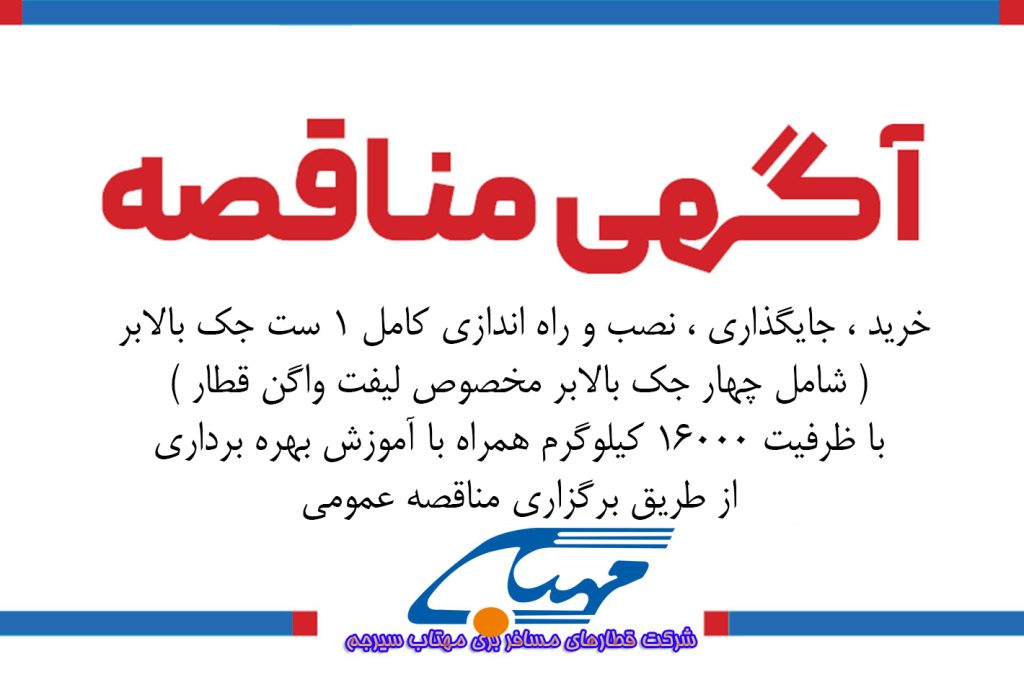 شرکت قطار های مسافری مهتاب سیر جم در نظر دارد نسبت به خرید ، جایگذاری ، نصب و راه اندازی کامل ۱ ست جک بالابر ( شامل چهار جک بالابر مخصوص لیفت واگن قطار ) با ظرفیت ۱۶۰۰۰ کیلوگرم همراه با آموزش بهره برداری از طریق برگزاری مناقصه عمومی و مطابق با شرایط و مشخصات مندرج در اسناد مناقصه و پیش نویس قرارداد اقدام نماید . لذا از کلیه اشخاص حقیقی و حقوقی که توانایی انجام موضوع مناقصه را دارند دعوت میگردد از تاریخ نشر آگهی تا پایان وقت اداری روز چهارشنبه مورخ ۱۴۰۴/۱۰/۱۰ نسبت به خرید اسناد مناقصه اقدام نمایند .