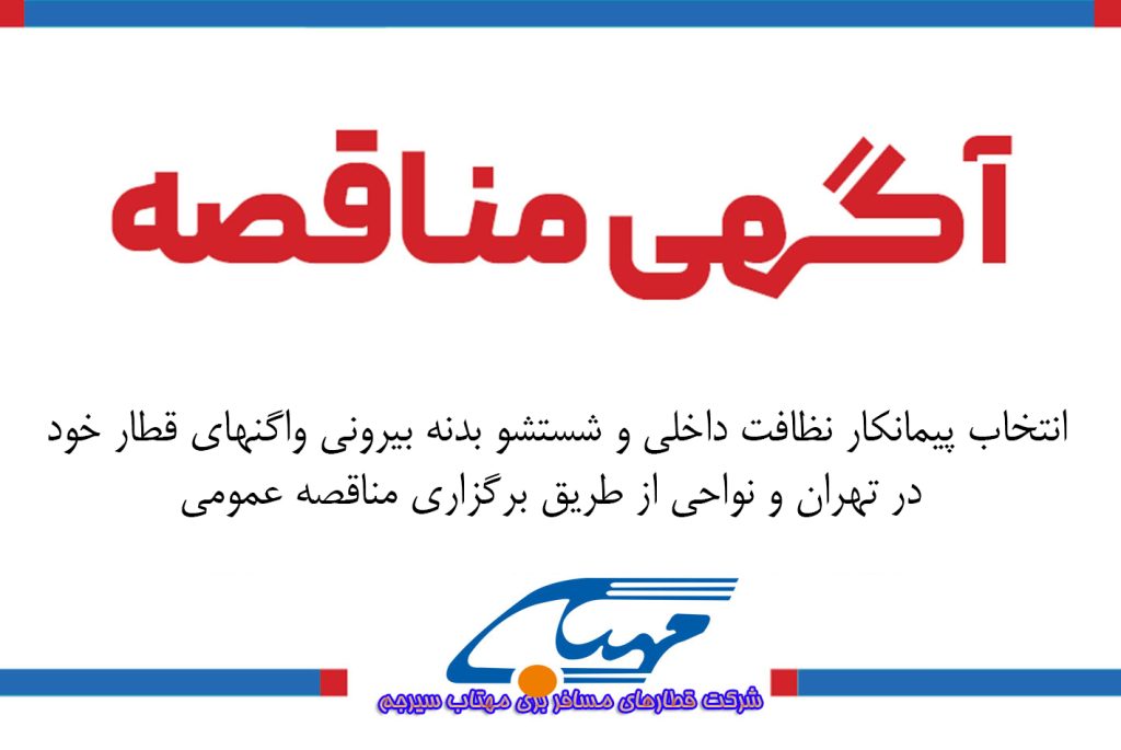 شرکت قطار های مسافری مهتاب سیر جم در نظر دارد نسبت به انتخاب پیمانکار نظافت داخلی و شستشو و جرمگیری بدنه بیرونی واگن های قطار خود مطابق با شرایط شرکت عمومی و مشخصات مندرج در پیش نویس قرارداد ، از طریق برگزاری مناقصه عمومی اقدام نماید . لذا از کلیه اشخاص حقوقی که توانایی انجام موضوع مناقصه را دارند دعوت میگردد از تاریخ نشر آگهی تا پایان وقت اداری روز یکشنبه مورخ ۱۴۰۱/۰۳/۰۸ نسبت به خرید اسناد مناقصه اقدام نمایند .
